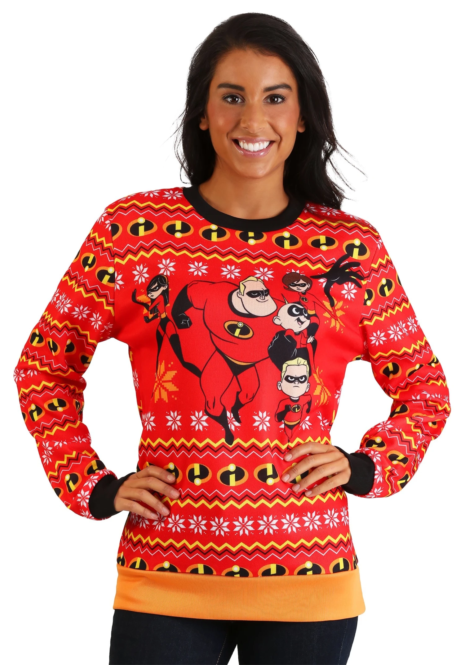The Incredibles Red Ugly Christmas Sweater combines the heroic style of the animated family with the cozy feel of an ugly Christmas sweater. The front has a repeating pattern of snowflakes and the Incredibles symbol. It also has the image of the whole family on the front, including Mr. Incredible, Elastigirl, Dash, Violet, and Jack Jack. Just slip it on and you’ll feel extra cozy during that holiday Christmas party coming up!